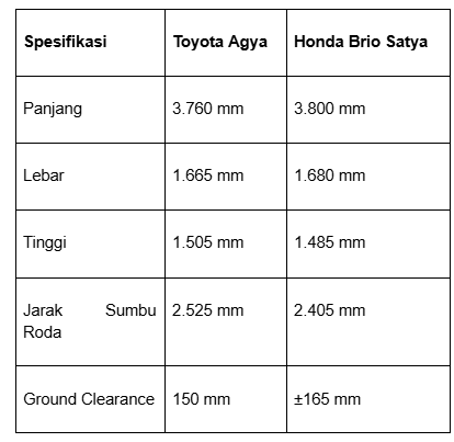 Secara ukuran, Honda Brio sedikit lebih panjang dan lebar, namun Toyota Agya memiliki jarak sumbu roda lebih panjang, yang berarti ruang kabin bagian dalamnya terasa lebih lega. Ground clearance Brio sedikit lebih tinggi, memberikan keunggulan saat melewati jalan bergelombang.
