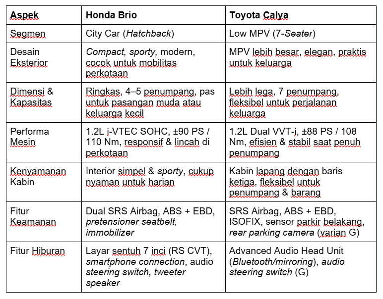 Sebelum menentukan pilihan, penting bagi AutoFamily untuk memahami perbedaan mendasar antara Honda Brio dan Toyota Calya. Keduanya memiliki karakteristik yang berbeda, sehingga cocok untuk kebutuhan yang juga berbeda. Mari bahas beberapa aspek pentingnya berikut: