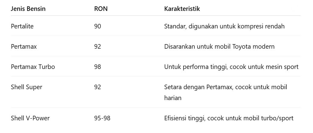 Mobil-mobil Toyota seperti Avanza, Yaris, Veloz, Raize, Corolla Cross, hingga GR 86 menggunakan bensin sebagai sumber tenaga utama, kecuali model diesel atau hybrid tertentu.