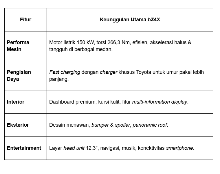 Membuka aplikasi navigasi, mendengarkan lagu, keterhubungan smartphone dan masih banyak lagi. Supaya Anda bisa memahami keunggulan mobil listrik Toyota bZ4X lebih lagi, berikut rangkuman informasinya dalam bentuk tabel.