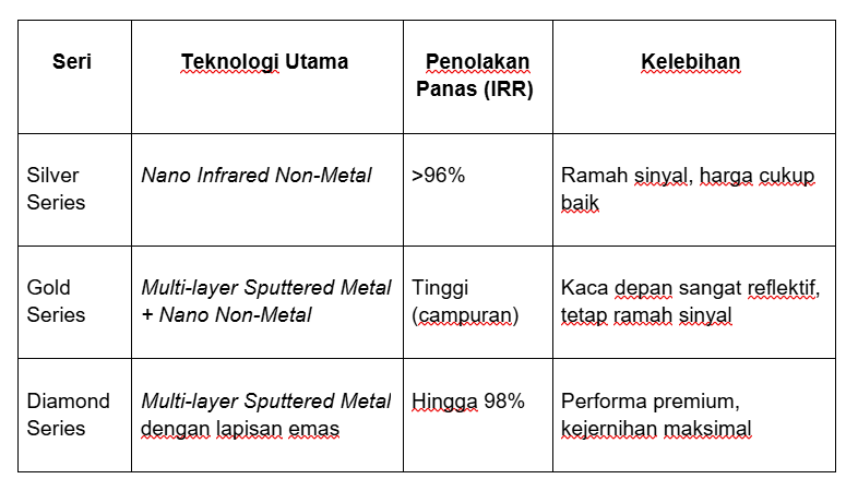Seri ini cocok untuk AutoFamily yang menginginkan perlindungan maksimal pada kaca depan, sekaligus tetap ramah sinyal pada bagian lain.
