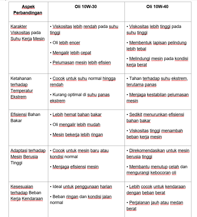 Jadi, 10W-40 lebih kental pada suhu panas dibanding 10W-30, yang memengaruhi performa dan proteksi mesin.
