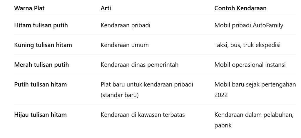 Jawabannya: tidak bisa, kecuali AutoFamily mendaftarkan kendaraan sebagai angkutan umum resmi dan mengubah statusnya di Samsat. Jadi, meski mobil AutoFamily digunakan untuk antar jemput atau rental, tetap tidak boleh menggunakan plat kuning tanpa izin resmi.