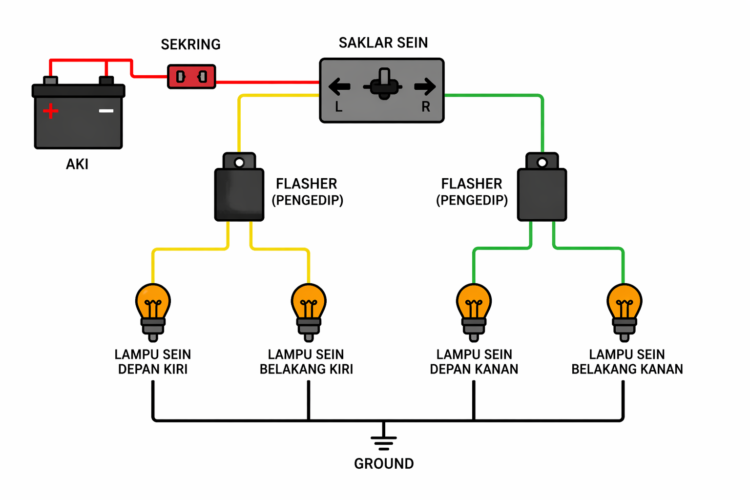 Dalam diagram sederhana, rangkaian lampu sein dapat digambarkan sebagai aliran listrik dari aki menuju saklar, kemudian ke flasher, dan akhirnya ke lampu.