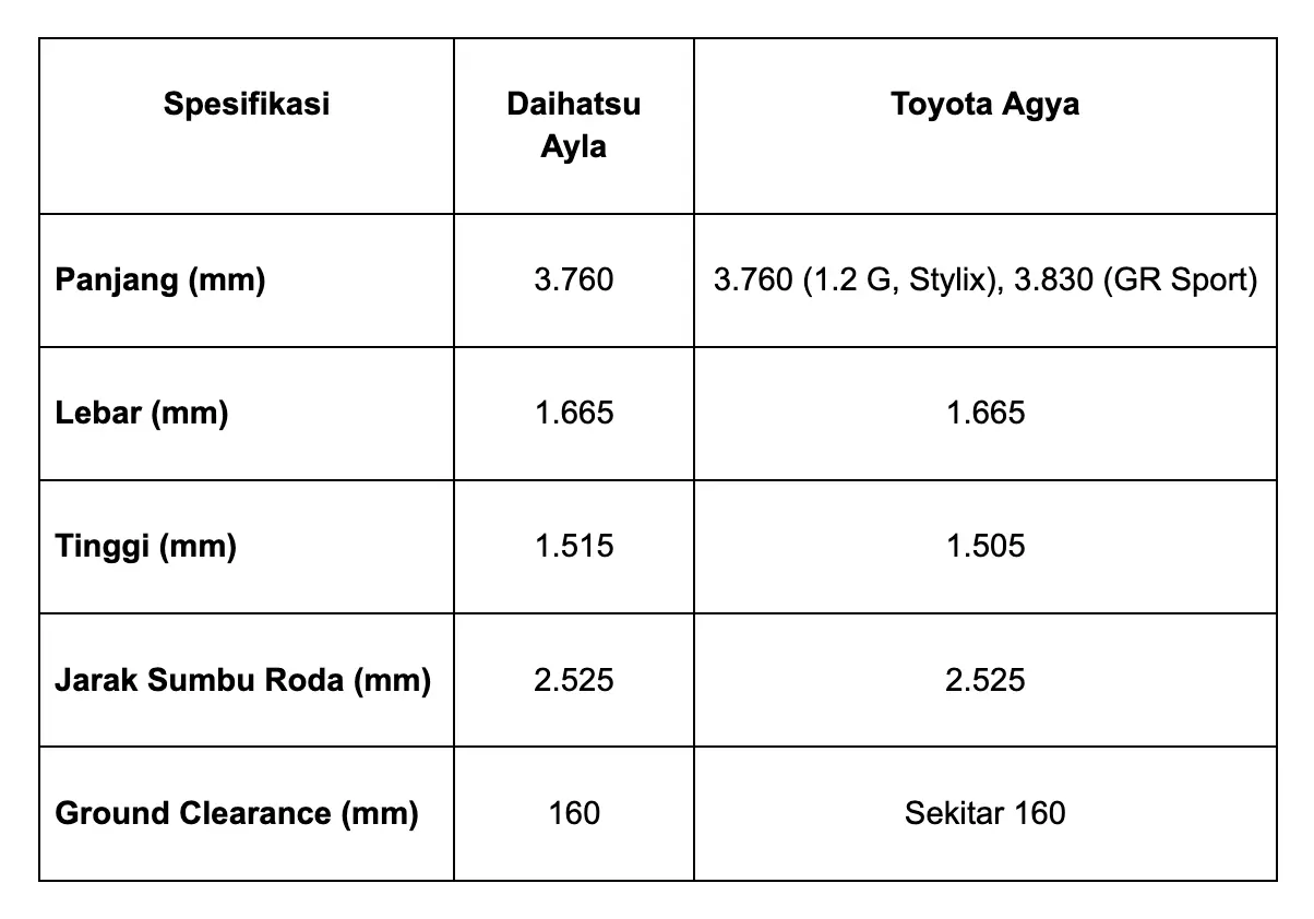 Jika dilihat sekilas, Daihatsu Ayla dan Toyota Agya memang memiliki basis desain yang sama karena dikembangkan bersama oleh Toyota dan Daihatsu. Namun, terdapat perbedaan kecil pada dimensi yang memengaruhi tampilan dan performa keduanya.