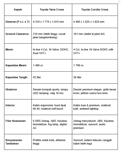 Tabel perbandingan Yaris Cross vs Corolla Cross