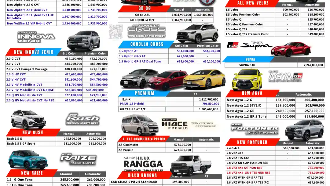 - Model Lainnya: Toyota juga menawarkan berbagai pilihan lain seperti Camry, Corolla Altis, Vios, Fortuner, Alphard, Hilux, dan Land Cruiser dengan harga yang bervariasi.