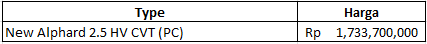 - Mobil dengan kenyamanan tingkat tinggi, dilengkapi fitur-fitur canggih dan premium, mobil ini biasa digunakan oleh para pejabat, eksekutif, atau sebagai mobil keluarga kelas atas, mobil ini dibandrol dengan harga sebagai berikut :