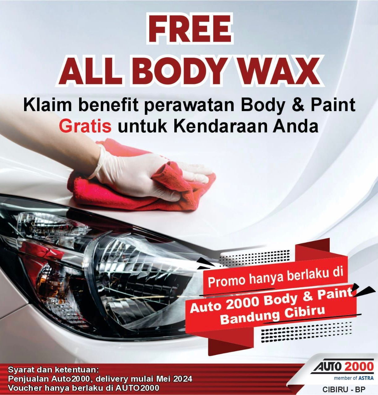 Bener banget, buat Auto Family sekalian yang melakukan pembelian kendaraan di Auto2000 Suci terhitung sejak Mei 2024 setiap selesai melakukan service berkala di Auto2000 Suci berhak mendapat benefit Wax All Body di Auto2000 BP Cibiru secara Gratis.