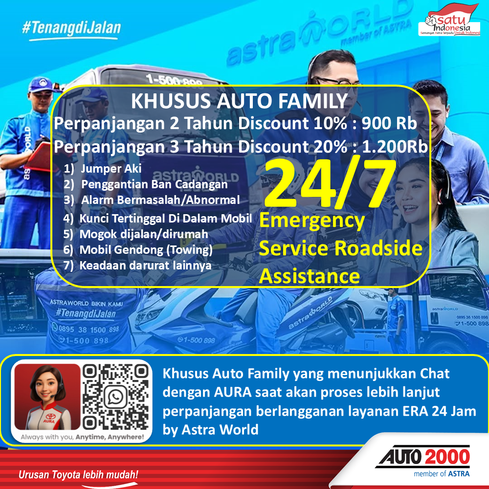 Kami mengerti pentingnya peace of mind bagi Anda Auto Family dalam perjalanan dimanapun. Setelah lima tahun dari tanggal pembelian, keanggotaan Astra World mobil Anda dapat diperpanjang dan tetap dapat menikmati layanan ERA (Emergency Roadside Assistance) AstraWorld melalui program ERA Extended Service.