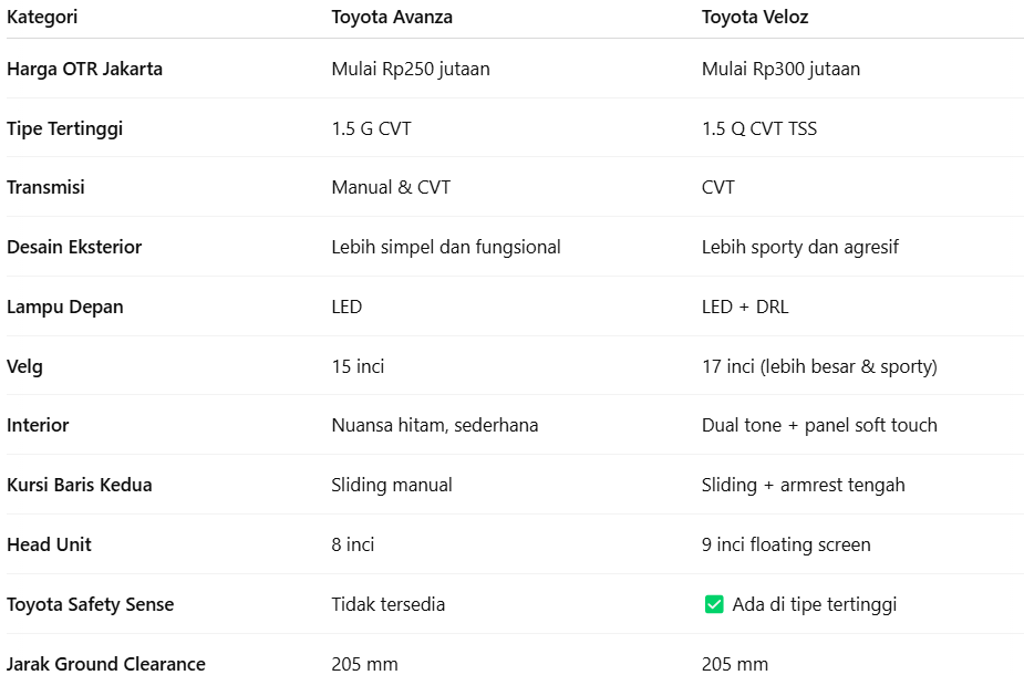 Tabel Perbedaan Toyota Avanza dan Veloz 2025:
