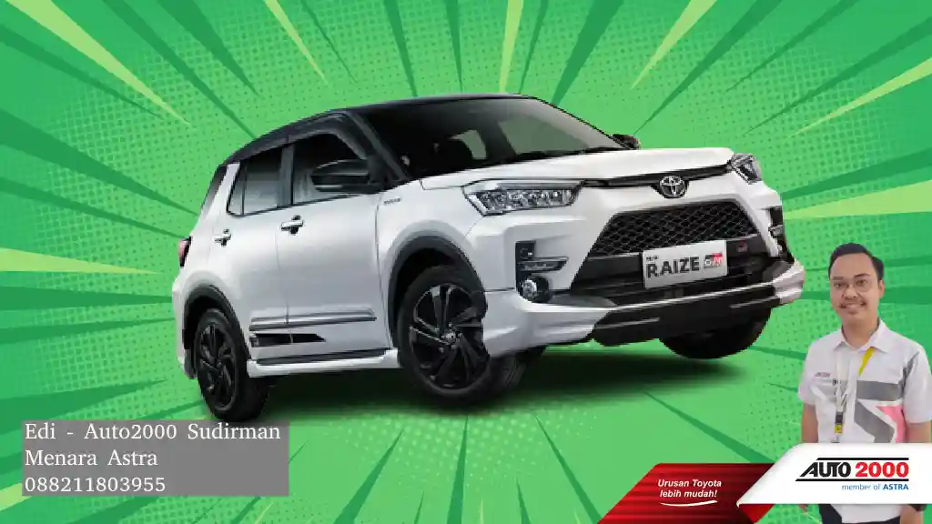Dapatkan penawaran terbaik Toyota Raize Mei 2025 hanya di Auto2000 Sudirman, Jakarta Pusat. Saya siap bantu proses pemesanan, trade-in, hingga pengajuan kredit dengan DP dan cicilan ringan!