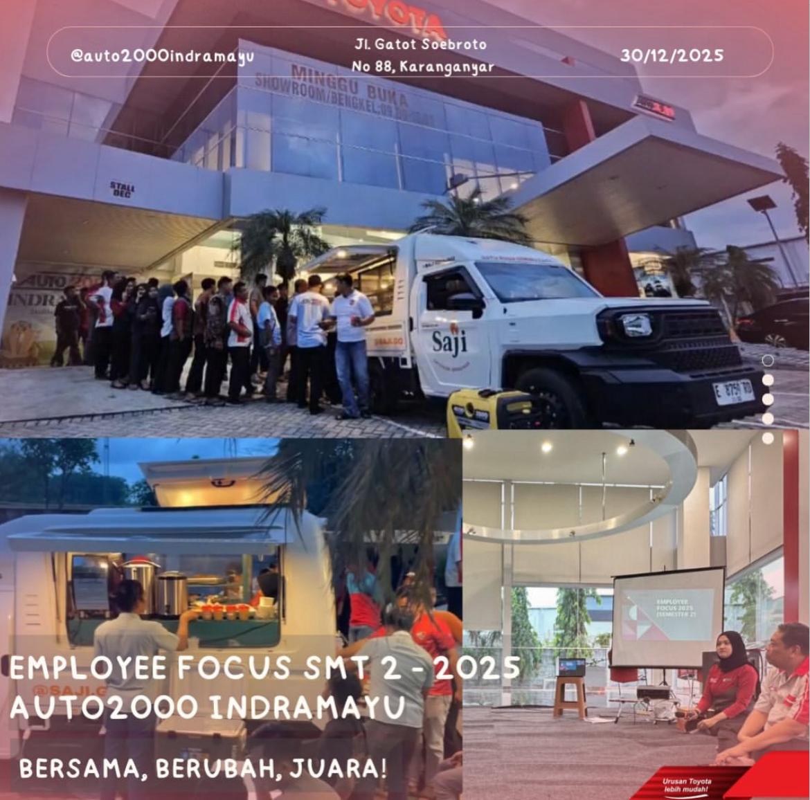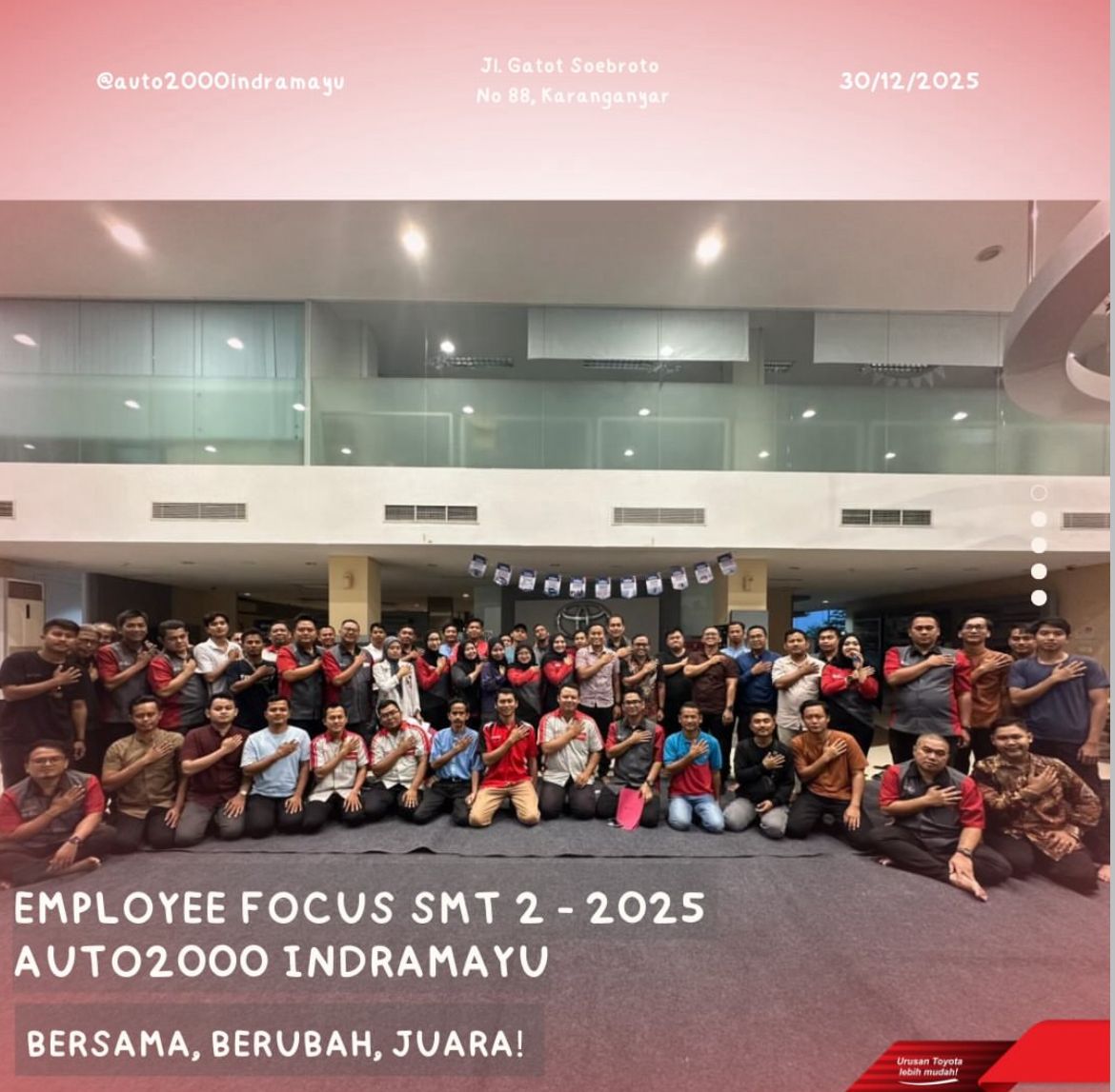 Employee Focus merupakan forum karyawan dan manajemen Auto2000 Indramayu yang berfokus pada pembahasan kebutuhan karyawan dan apresiasi kinerja karyawan setiap semester. Employee Focus semester 2 dilakukan oleh seluruh karyawan dan manajemen Auto2000 Indramayu pada 30 Desember 2025.