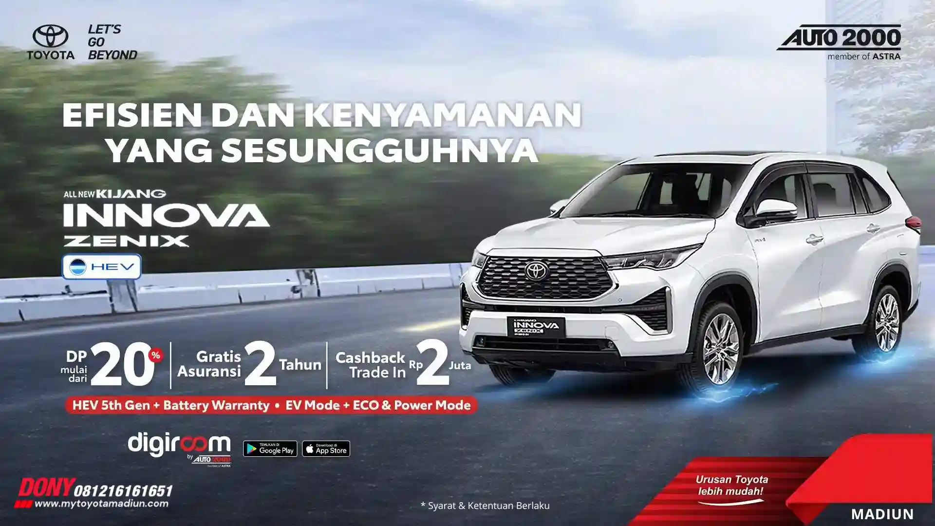 Khusus untuk Anda yang berada di wilayah Madiun, Magetan, Ngawi, Ponorogo, Pacitan, Nganjuk, Bojonegoro serta Jawa Timur, Jangan lewatkan kesempatan istimewa ini! Kunjungi showroom Toyota Madiun di Jl. Cokroaminoto No. 47 Madiun atau hubungi DONY TOYOTA via WhatsApp 081216161651 untuk informasi lebih lanjut. Toyota All New Innova Zenix 2025, teman setia perjalanan keluarga modern Indonesia!