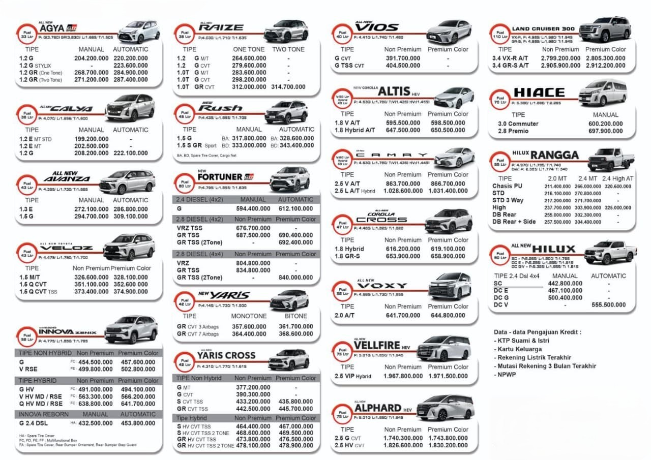 Berdasarkan pricelist on the road (OTR) Sumatera Utara, saya (Sumi) telah merangkum pilihan unit Toyota untuk Anda—mulai dari yang paling terjangkau hingga lini premium yang eksklusif.
