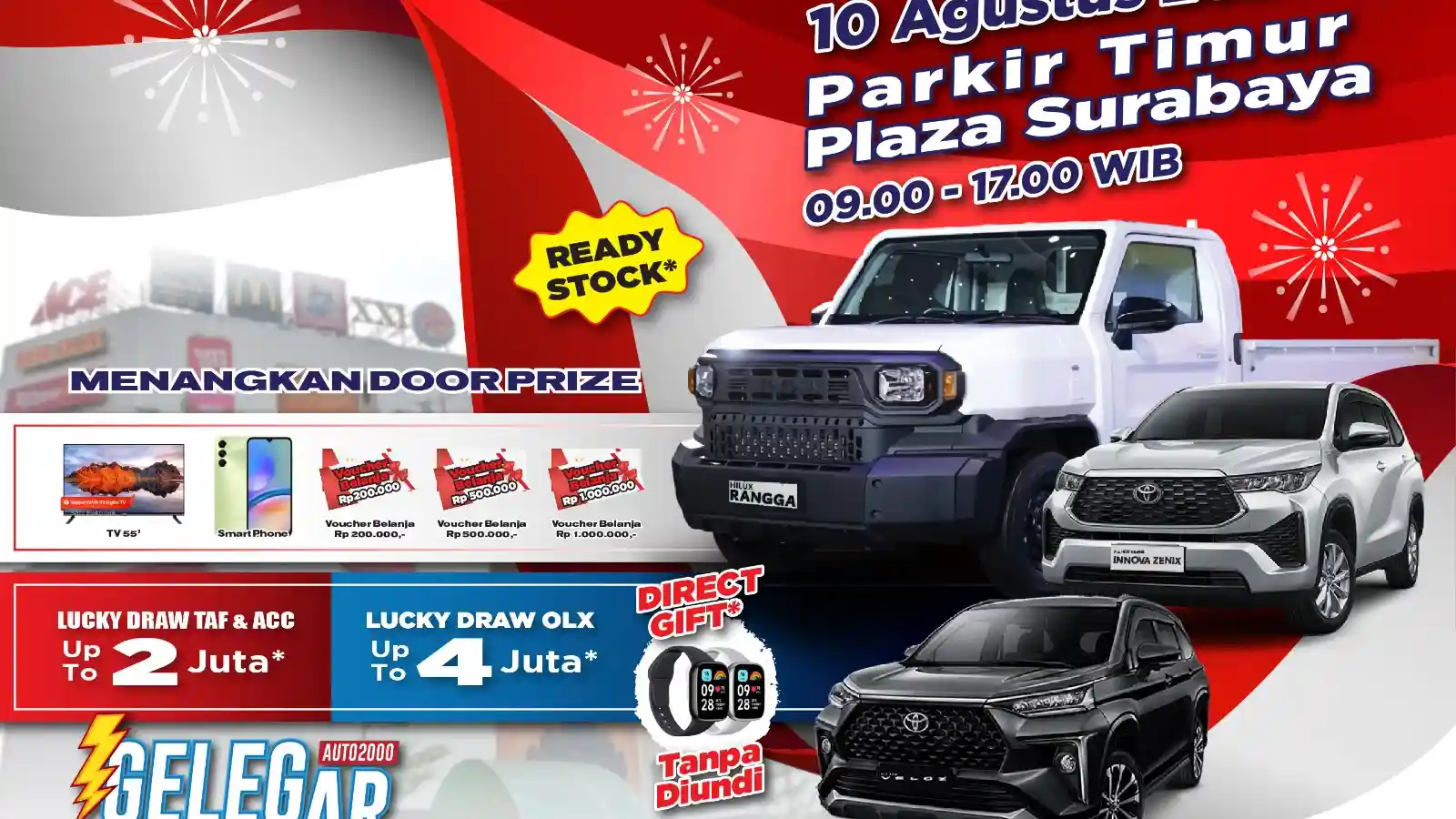 Sebagai preferred dealer Toyota di Indonesia, Auto2000 Kertajaya selalu memberikan kemudahkan kepada konsumennya dalam memiliki kendaraan Toyota baru. Khusus untuk warga Surabaya dan sekitarnya, Auto2000 Kertajaya menyelenggarakan even Bursa Toyota Kita (Burtok), ragam penawaran menarik diberikan kepada AutoFamily. Bertempat di Parkir Timur Plaza Surabaya yang berlokasi di Jalan Pemuda No.30-37, Embong Kaliasin, Kec. Genteng, Kota Surabaya pada Sabtu, 10 Agustus 2024. Dengan konsep One Stop Shopping warga Surabaya akan dimanjakan dengan berbagai kemudahan yang diberikan Auto2000 Kertajaya dalam memiliki kendaraan Toyota . Apa saja sih kemudahan dan promo spesial yang akan diberikan Auto2000 Kertajaya bagi konsumen ? Burtok Auto2000 Surabaya menyediakan beragam program promo seperti GELEGAR AUTO2000, menyediakan yang muka ringan mulai dari Rp 5 jutaan, bunga rendah mulai 2,9% sampai 3 tahun, dan smartcash bunga 0% 1 tahun, tentunya syarat dan ketentuan berlaku.