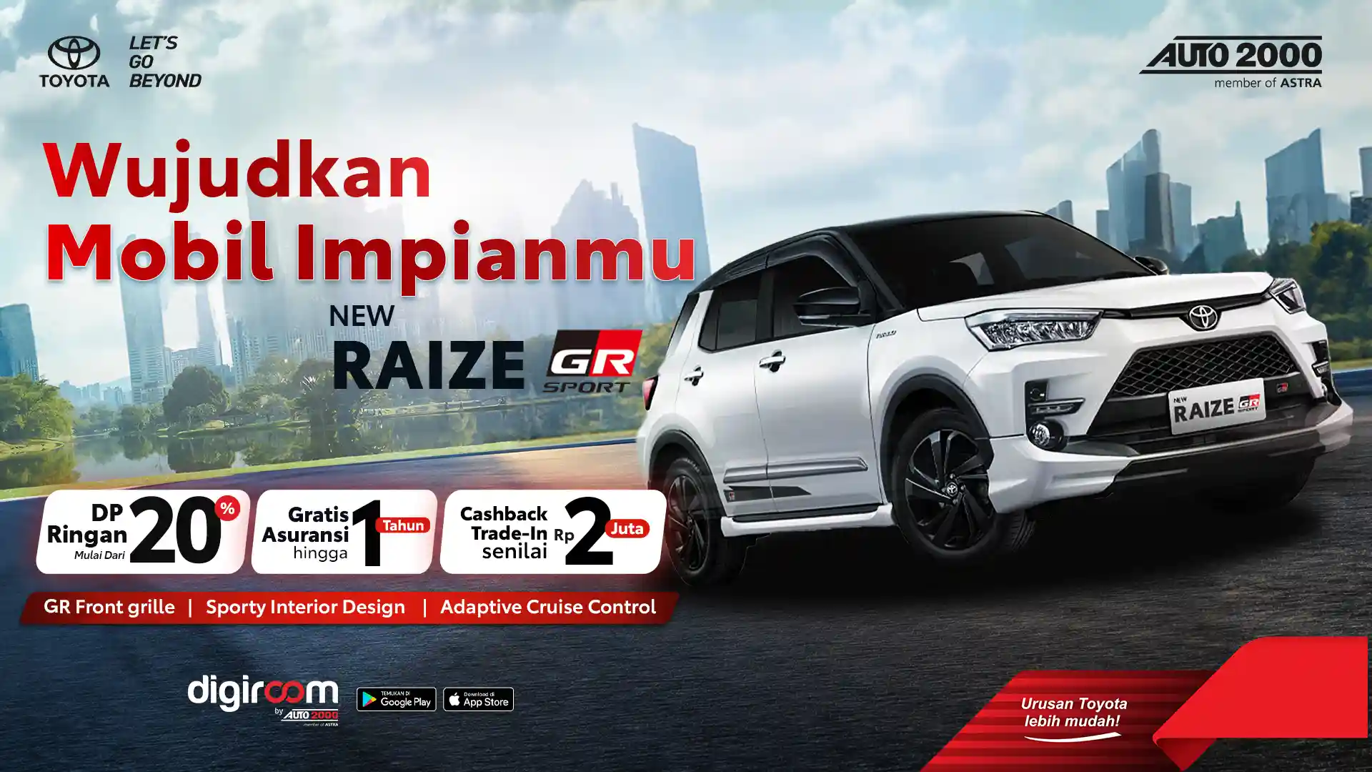 Miliki Toyota Raize dengan mudah di Auto2000, dengan DP Ringan mulai dari 20%, Gratis Asuransi hingga 1 tahun, serta Cashback Trade-in mencapai 2 Juta