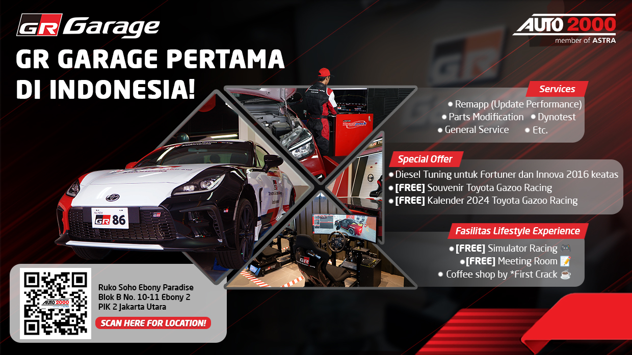 Auto2000 dengan bangga memperkenalkan GR Garage by Auto2000, showroom dan bengkel Toyota dengan nuansa Gazoo Racing yang hadir untuk memberikan pelayanan prima kepada AutoFamily dalam Penjualan mobil Toyota baru, Perawatan servis berkala dan AutoFamily dapat memodifikasi kendaraan loh!