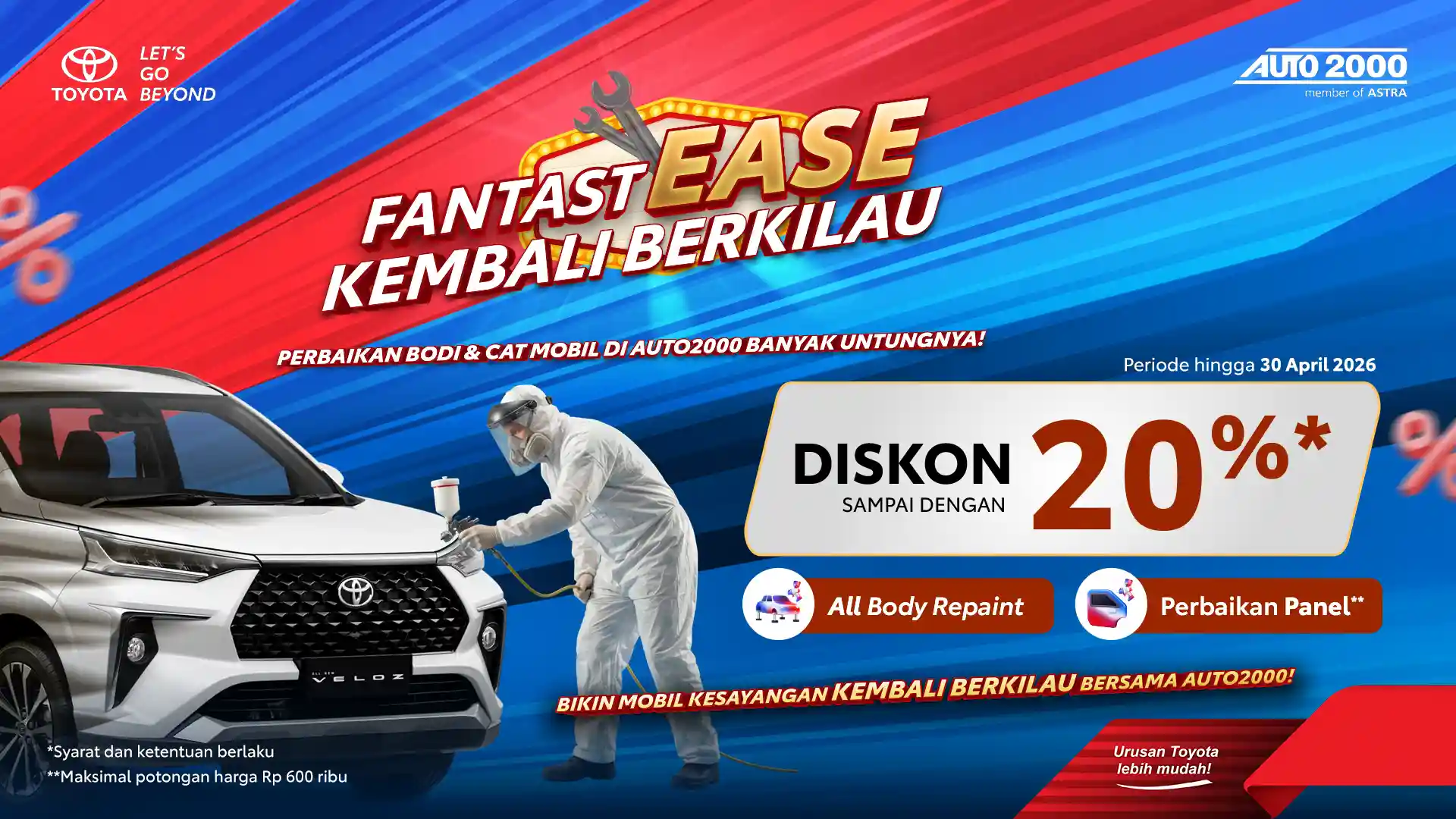 Mobil kusam, baret, atau penyok? Saatnya balikin tampilannya jadi kinclong lagi! Nikmati promo spesial Fantastic Ease Kembali Berkilau dari Auto2000 dengan diskon hingga 20% untuk layanan body repair dan pengecatan mobil. Dikerjakan oleh teknisi profesional dengan standar Toyota, hasilnya bukan cuma rapi—tapi juga tahan lama dan terlihat seperti baru keluar showroom.